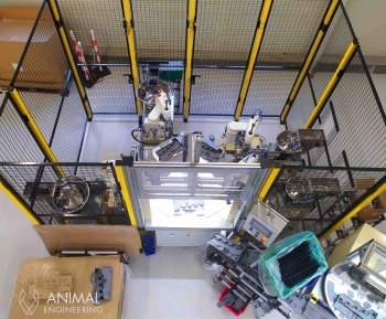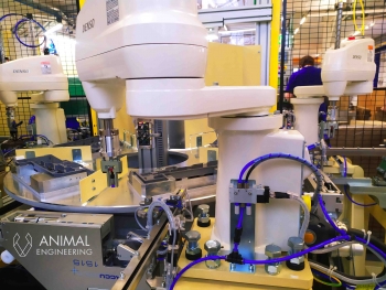 Realizacja: zrobotyzowane stanowisko pracy, 4 x robot Scara do precyzyjnego montażu sprężyn we wkładzie.